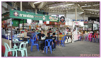 來到外頭的廣場區也有不少小攤,中間的服務櫃台前就都是一排排VAN的櫃台,有往歐士水上市場、安邦哇、華欣的….車資從百來銖到華欣的180銖,來回看了幾個櫃台,坦白說秀出英文的不多,大部分都還是泰文,但你若說HUA HIN他們都會知道的,相信不久後這裡都會在貼心的為觀光客貼出標語的。