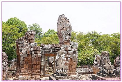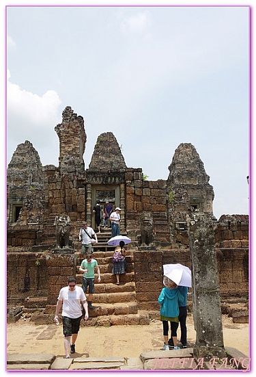 『東美蓬』分別使用了高棉建築的三大建材:磚塊、砂岩、紅磚,城牆雙重環繞,內城牆就像是金字塔的第一層結構,塔廟多半以磚為建材,敷上泥土的外牆有許多小洞,本來還以為是不是以前有嵌入寶石,後來戰亂被挖走後的痕跡,仔細一看也未免太多洞了吧,且還在外牆,應該是當時技術不夠純熟,不過遠處看整體還是有建築的美學啦!
