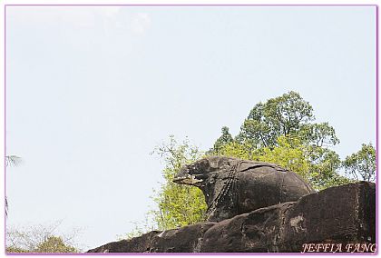 『巴孔寺BAKONG』內外兩層護城河及三層圍牆,第二道圍牆內參道上的有納迦NAGA欄杆顯示為後來吳哥建築黃金時期的草圖了,比較特別的是圍牆上有大象站崗著,居高往下看也不禁讚嘆這景物不依舊,往事更只能回味。