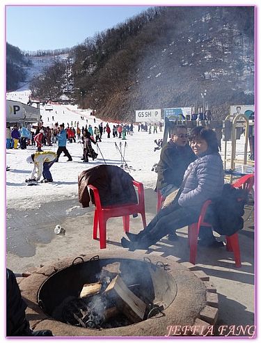 這雪場不大,一入內與其他雪場感覺差不多,令我多看兩眼的卻是工作人員忙著不斷加碳,讓客人爭相窩著取暖的火坑,看著來來往往穿梭滑雪的客人,繽紛的雪衣讓陽光普照的雪白大地,多添了許多色彩。