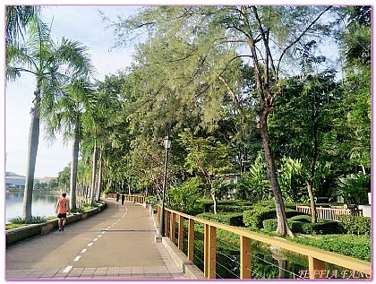 有著詩麗吉皇后圖標的『班嘉奇蒂公園BENJAKITTI PARK』,正位於曼谷摩登高樓林立的市中心,在現代化建築圍繞及花花草草的襯托下,橢圓形中間有個約兩公里直徑的大湖,環繞這大湖的正是『優質步道』;傑菲亞娃認真跑一圈計算下來大約是兩公里,算是小巧可愛的「好公園」,多跑幾圈也有趣非常。