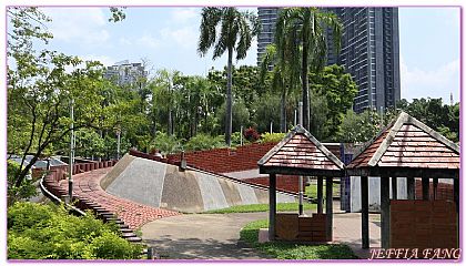 在這個長方形的公園內,設有不同橫跨湖面的小橋,當地百姓喜歡稱之為觀魚橋,買了魚飼料在此享受餵食的樂趣,也算是種另類娛樂。喜歡路跑的朋友可以選擇不同距離的環湖路跑,路面上秀有公里數,傑菲亞娃繞最近的一圈大概也有2.5公里,多繞兩圈5公里完成,活力滿滿。