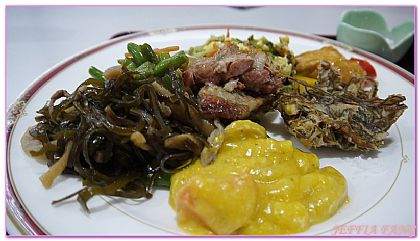 當然,這麼大的園區一直「順路」逛逛鐵定會餓的囉,這時候絕對不能錯過的就是專門提供琉球美食的健康自助餐廳『CHURA島』,說真的菜色真的是出人意料的多ㄚ,以當地新鮮的食材EX.蔬菜、香草、近海魚..等烹調出80多主以上的美食,且多半是養生為主的飲食概念,EX. 著名的炒山苦瓜、滷軟骨排、沖繩湯麵、醋褐藻..等都有;傑菲亞娃光吃苦瓜及豆腐料理就大呼過癮呢。