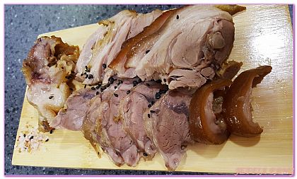 大夥一坐定,餐廳服務人員親切的把小菜放上,最後送上「木板上豬腳」,豬腳口感較乾爽不油膩,Q軟的膠質非常有嚼勁,沾醬或包生菜大口吃,都好吃的不得了;除了主菜豬腳外,不同店家會附上2-3種小菜,包括醃蘿蔔、韭菜、生洋蔥、血腸等,沾醬則有特製的味噌、醬油醋、蝦醬等不同選擇,但老闆建議我們先沾沾鹽巴先試試原味。