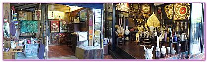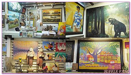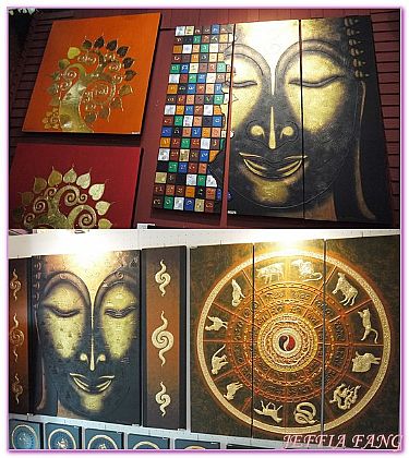在『HUA HIN ARTIST VILLA華欣藝術村』並不是只有泰國的藝術家,有位法國藝術家的相片及作品也在這,在木造的空間裡穿來穿去的欣賞畫作霎那間也覺得有些許氣質在身,而來到宗教藝術這區,許多神情(神像的表情)及太極五行、12生肖等..,讓人有股祥和的安寧,此時微風一吹~嗯,「心靜自然涼」。