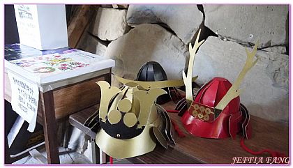 爬上緩坡從北虎口門進入很是閒靜優雅,在門口蓋了紀念章,便直往天守閣了,沒想到莊嚴的天守閣門口居然提供簡單的武士配件,小朋友帶著拍拍照町是有趣的。外表三層天守閣其實有五層樓,城內展示著平戶藩時代的遺物與文化遺產,一路登頂,可以從天守閣看到黑子島、馬度島的美麗海景,還能夠眺望平戶大橋,簡單來說:平戶城是建在三面環海的丘陵上,建議大家要爬到最高處,千萬別錯過城堡與海洋的美景。