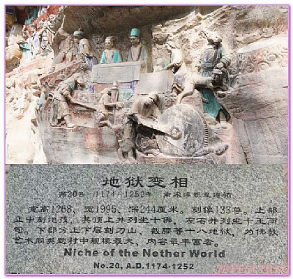 ◆我們在導覽的說明下仔細看了『寶頂山石刻』,資料顯示這有大、小佛灣等共十三處景觀,以大佛灣石刻造像規模最大。這裡有多幅生活場景和佛經中的故事,其中以大佛灣的「六道輪回圖」和小佛灣的「十惡罪報圖」最為獨特。