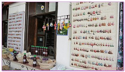 來到「席林潔山城」,沿著小彎的山路慢慢走,兩層紅磚白牆的民宅是許多餐廳民宿,但第一吸引觀光客的目光卻是販售各種手編織品、橄欖油、葡萄酒、冰飲品及衣服包包等商家,儼然已成為觀光市集小鎮。