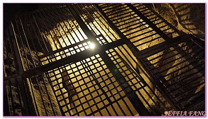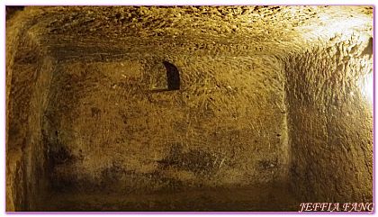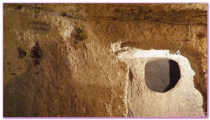 大夥彎著腰走進洞內,都只有微微燈光,所以都要小心翼翼的,在第一、二層的油燈處有發現教堂及祭壇(逃難生活也不能忘了宗教及祭祀),這裡一個洞就代表一個家庭,不要小看地下洞穴,什麼都有,廚房餐廳睡房無一不缺,居然還有釀酒室、食物儲藏室,我都不知道怎麼形容了,最讓我佩服的是,來到第三層有的大石門,旁邊有個通道,這可真是太有頭腦了,因為導覽說這是萬一有敵人發現這地下城入侵近來,就會關上這大石門堵住出口,就不會再向下入侵了,媽呀!這不就是機關算盡的意思了嗎!