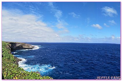下車後,氣氛突然哀戚了許多,原來我們來到知名的『萬歲崖Banzai Cliff』,塞班島有不少的斷崖,這裡是最北端的,周圍的海浪拍打著岩石散成美麗的泡沫花,碧海藍天與朵朵白雲的構圖是最美的一幅畫,如此美景任誰都無法聯想到這萬歲崖的由來。