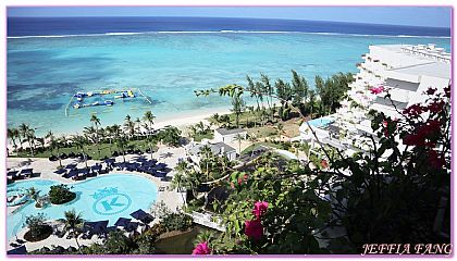 一路小巴開往肯辛頓酒店時,傑菲亞娃發現這片海特別美麗,遠遠的環礁形成一圓弧白線,一邊的湛藍一邊的TIFFANY藍,實在讓我找不出多貼切的形容詞,太美太夢幻了。