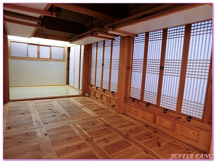 沿著溫突就開始韓屋東側的「舍廊」這裡的房間是以柱子來區隔的,也就是兩根主子中間就是「一間房」而可吊上去的「開合門」就成了不同需求的好幫手,非但如此,這樣的功能設計還能讓整個空氣對流,在炎熱的夏季也能保有一股清涼,如此「冬暖夏涼」的韓屋,真的是老祖宗的智慧啊!