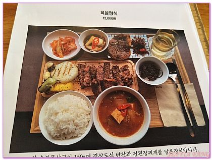 當天運氣很好,沒什麼等就入坐了,打開菜單雖然是韓文但有照片及價錢,觀光客點餐起來並不太困難,餐點有套餐也有單點肉盤,中午有提供8500韓幣的咖哩餐,其它會分豬肉、羊肉、牛小排的大小拼盤。