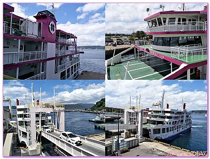 來到水族館前我們快步上碼頭,沒想到前往櫻島的渡輪非常大,是哪種人車都上船的大船,且不是只有一家船公司,看所持票券搭乘不同船隻,船內非常舒適,船上有個超人氣的拉麵店,由於才賣450日幣又好吃,很多乘客都會在此排隊,但我想15分鐘就能到的航程好像也不太需要特地去吃上一碗,於是就在甲板上吹吹風,想著篤姬離開的那一幕,也算是與歷史扯上些許關係了。
