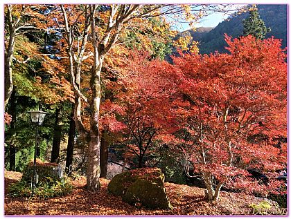 接著爺爺起身帶我們從後面的小門穿過,眼前的房子果真在參天樹木下顯得迷你,爺爺說這裡有百來株的楓樹,不要說是秋天紅葉滿布就算是四月來訪都會被一整片漸層綠散發無比的清新,而六月更是螢火蟲活耀的時期,可以說是四季皆美的溫泉度假村。