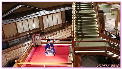 從大廳走入眼前一片的高低讓我有股誤闖迷宮的錯覺,隨著琴音定眼一看,才發現這個往下交錯的層次夾著個中央舞台正上演著日本式三弦的演奏,這層次是我從未在日本飯店見過的。空間以木頭為主角,連櫃檯都是,迅速拿到房卡後領著行李要進房間前,發現櫃檯旁邊有各式各樣的浴衣,女孩們如果喜歡那一套可以500日幣來租借(房間內也有)。