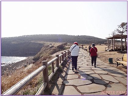 位於濟州島偏西最南端的『松嶽山戰地洞窟』就像是瞭望臺,可看到馬羅島、加波島、山房山及漢拏山山頂。一到松嶽山入口處,走上木棧石板步道,環顧四方,氣溫雖低卻見陽光,感覺甚好!