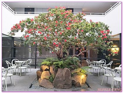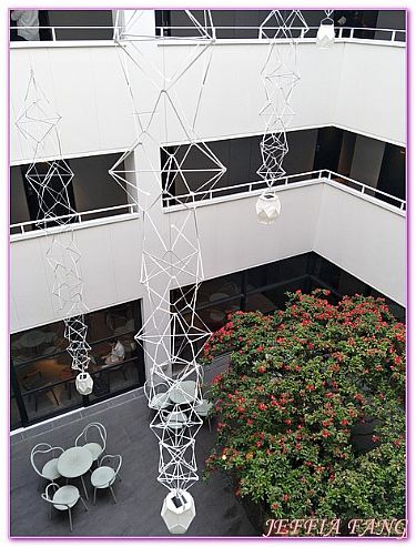 傑菲亞娃持房卡感應了側門上電梯來到自己的房間。五層樓的建築物,中間是天井,2樓到5樓的房間群都圍繞著天井,而從樓上俯瞰下天井的中心正是一株來自琉球的「紅杜鵑」,這種四方天井一點紅的構圖,跳脫剛剛Lobby給我的時尚感,可以說是現代感與禪風的大結合,很棒。