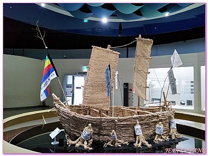 從手扶梯上2樓就是海洋展示館,分左邊開放式的及右邊室內展示;館內收藏了1萬4千多件的展品,大家可藉由這些海洋文物縱觀過去、窺探未來,另外還設置了8個常設展示館與企劃展示館、兒童博物館等展覽場區。傑菲亞娃對2樓仿古的「朝鮮通信使船」看了許久,栩栩如生還有背景與之拍照滿好玩的,另外還有些仿開船的互動遊戲也算有趣,雖然規模不大,但走著、看著一下子就到40分鐘可以去取我們的魚板了,呵呵~由於不需要門票也不失為打發時間的好地方。