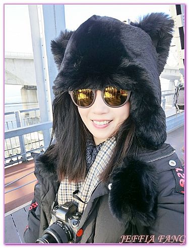 我們在「松花江陸橋」快速拍照後就急著下去親臨「松花江」江面了,由於並無全面結冰,遊客只能在規定的冰面上活動,許多冰上遊戲的店家不斷招攬客人玩雪上甜甜圈或是雪橇好不熱鬧,但傑菲亞娃覺得腳踏踏松花江冰面已是一大樂事,開心享受即可。