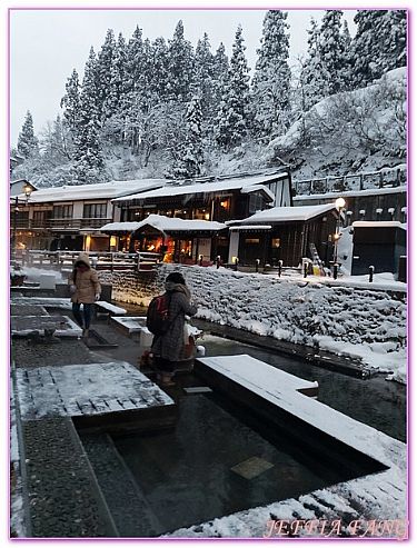 由於我們想要拍到打了燈的銀山溫泉,於是算好時間約莫5點前抵達,大巴士來到銀山溫泉停好,需往下走一段路,我們抵達的時候下著大雪實在凍壞了,但突然看到溪谷雪白一片的屋宅真的是美翻了,再冷都值得。