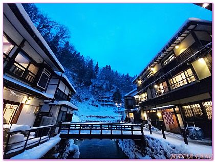 正式開始我的「銀山溫泉街」散策,銀山溫泉街位於銀山川的上游分支,最左側的河川源頭是白銀之瀧,順著河川的兩側有成排3層或4層樓高的木製建築,幾座橫跨兩邊的橋形成了銀山溫泉特殊景色,由於大都是昭和大正時期蓋的,黃昏時煤炭燈打上懷舊古典的感覺特好。