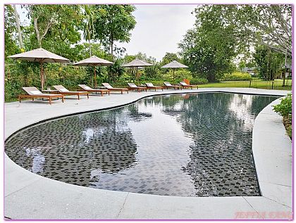還在享受沁涼的迎賓飲料時,我們的入住手續已經辦好了,隨著管家前往住房的路上,我們的眼睛完全沒有空檔。諾大的草地上,各種造型的樹木、植物給了我最舒心的好感,泳池兩邊的Bar及餐廳,擺放在落地窗前的深色木製餐桌椅,正對著綠樹成蔭的花園,整個空間太美妙。